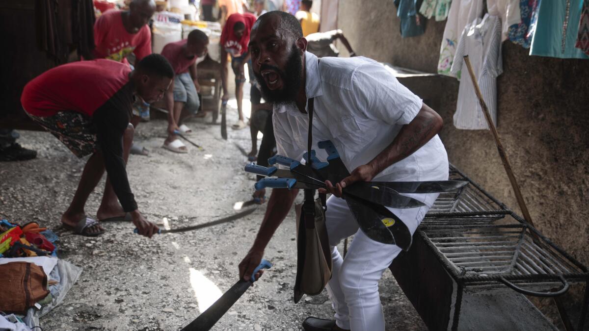 Nertil Marcelin, líder de un grupo comunitario, y miembros de la comunidad golpean machetes contra el suelo el domingo 28 de mayo de 2023, en respaldo al movimiento "Bwa Kale", una iniciativa para combatir a pandillas que intentan controlar su vecindario en el distrito Delmas de Puerto Príncipe, Haití. (AP Foto/Odelyn Joseph)
